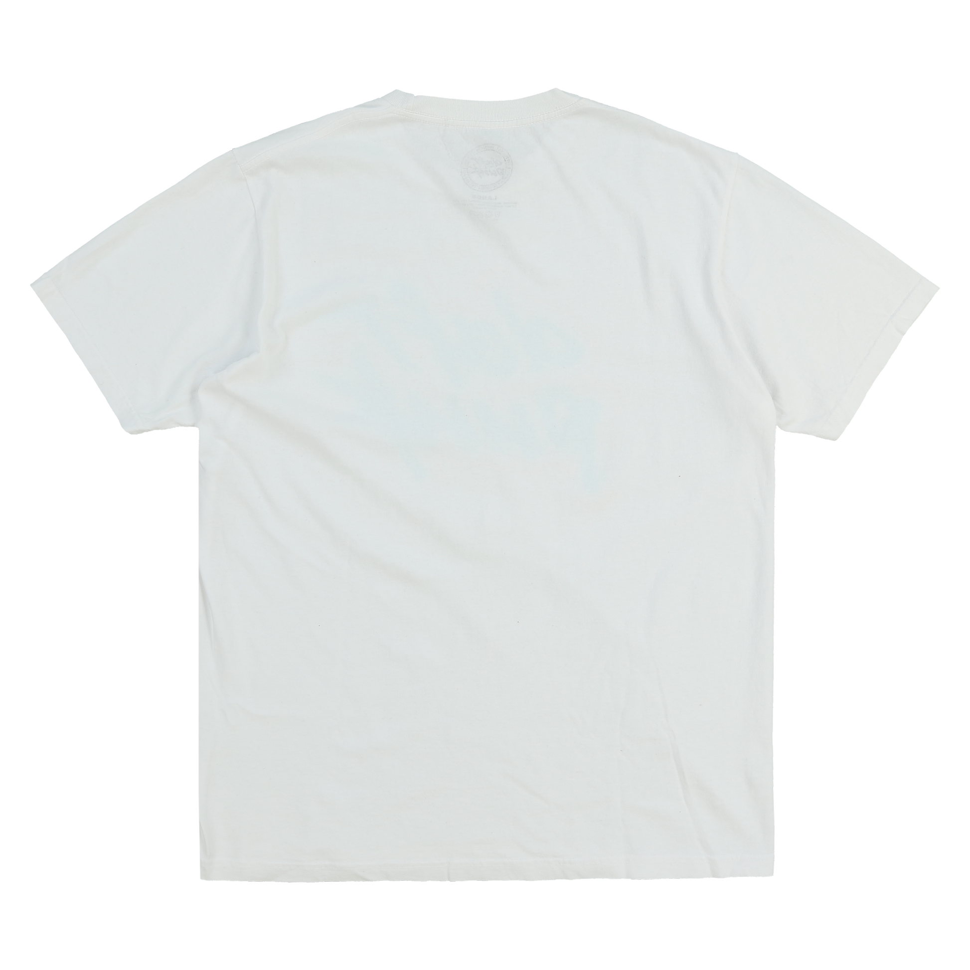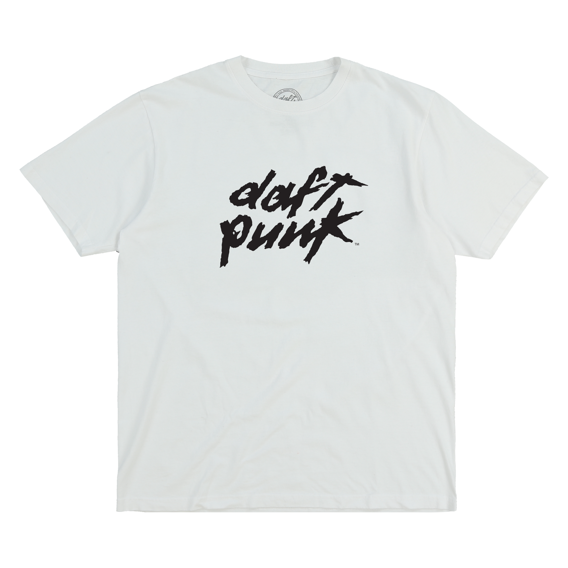 White tee featuring classic Daft Punk logo printed in black. Unisex fit and printed neck label.